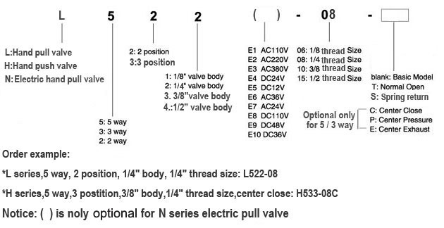 There're 3 styles of the hand valves, one is L series hand pull valves, another is H series hand push valves, the other is N series electric/hand pull vales. For the former two series we have 5/2, 3/2, 5/3 ways from 1/8" to 1/2", both for normally hand push back and spring return, and for some Europe customers preferring bigger sizes hand valves, please check the PDF file for the dimensions for hand valves and see if it's what you want.